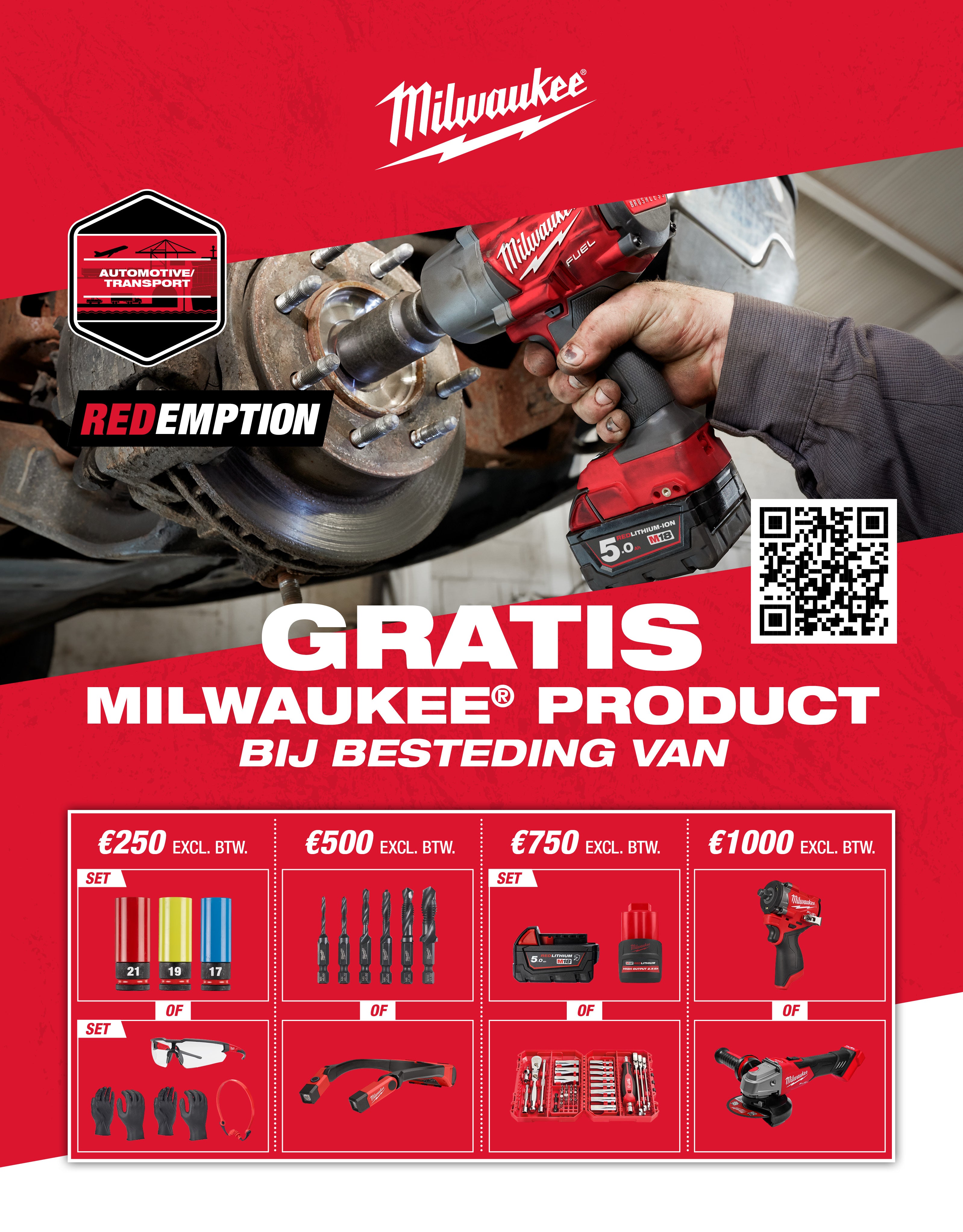 De gehele maand Oktober ontvangt u bij besteding van €250,€500,€750 of €1000 excl. BTW gratis Milwaukee producten.