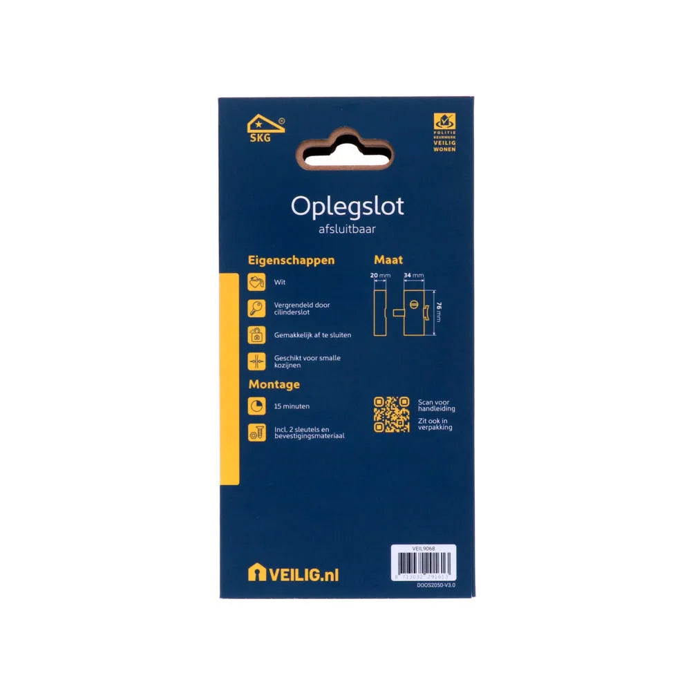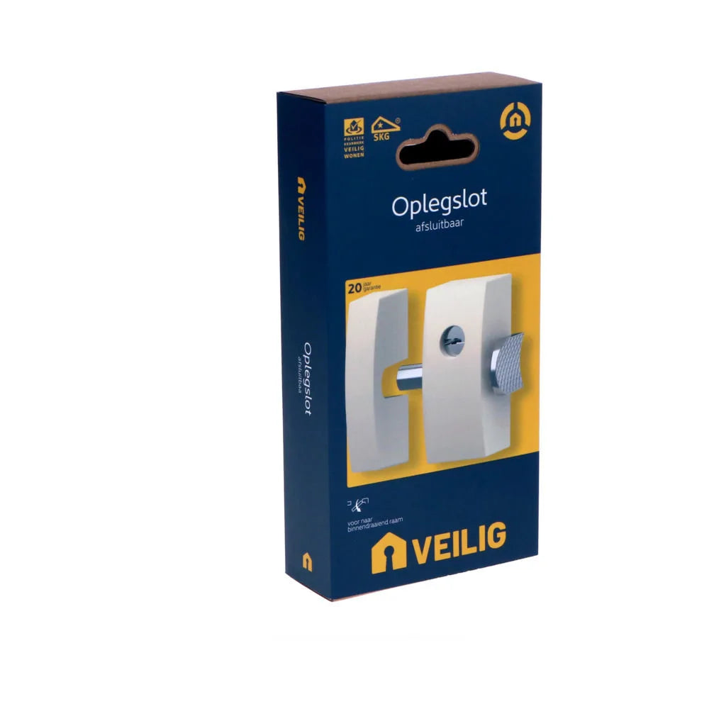 Op zoek naar een extra veiligheidsslot om naar binnendraaiende ramen of deuren extra veilig af te sluiten? Het Veilig oplegslot is SKG* gecertificeerd en eenvoudig in gebruik. Met dit smalle maar krachtige, inbraakwerende oplegslot vergrendel je van binnenuit jouw raam of deur met één handeling. Je vergrendelt het slot door de drukknop aan de zijkant in te drukken. Met de meegeleverde sleutel ontgrendel je het slot. Het Veilig oplegslot is universeel toepasbaar op zowel draai- als klepramen en bijzonder geschikt voor smalle kozijnen met een minimale breedte van slechts 32 mm. Het slot bestaat uit twee delen: het sluitdeel en het slotdeel. Het sluitdeel wordt op het kozijn gemonteerd en het slotdeel op het raam bevestigd. Om te voldoen aan de eisen van het Politiekeurmerk Veilig Wonen, moet het Veilig oplegslot altijd per twee stuks of in combinatie met een ander SKG-gecertificeerd product worden toegepast.